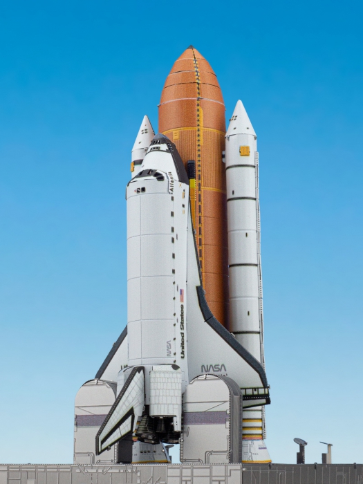 The Space Shuttle Launch Kit Premium Series metal modelling kit includes 3 metal sheets containing components of the Space Transportation System. Parts can be removed from the metal sheet by hand, however a pair of wire cutters is recommended. In assembling the 3D model, tweezers make an ideal tool for bending and twisting connection tabs. Shuttle nameplates are included in the kit: Atlantis, Discovery, Endeavor and Enterprise.