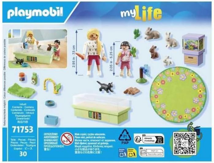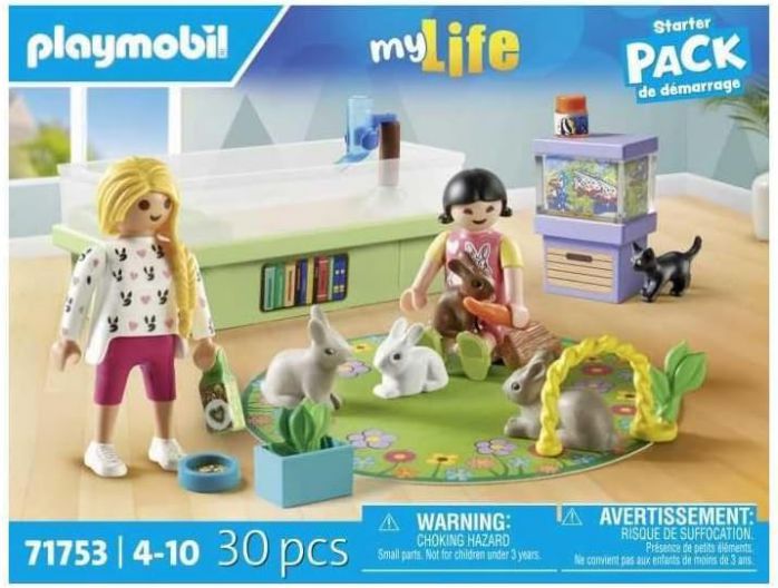 The 30 piece Starter Set includes two Playmobil figures, a rabbit family, a kitten, and a range of accessories to inspire diverse play scenarios. With the enclosure, aquarium, and play mat, kids can invent new adventures again and again.