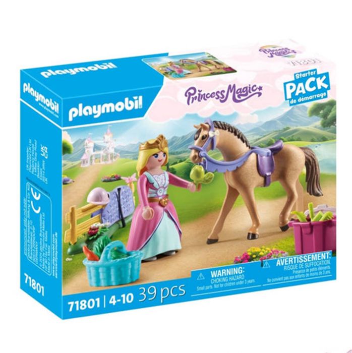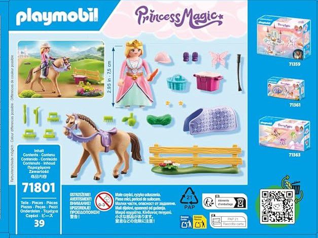 This 39 piece set includes a Playmobil Princess figure, a horse, a buttterfly, flowers, decorative bows and stars to adorn the horse's harness, grooming tools and many other exciting accessories.