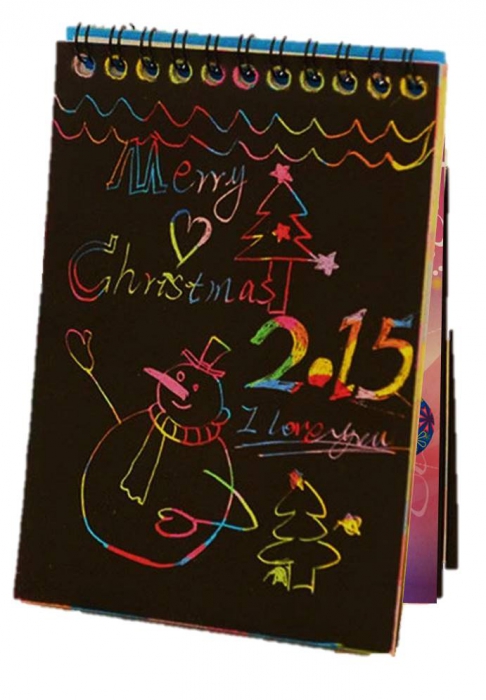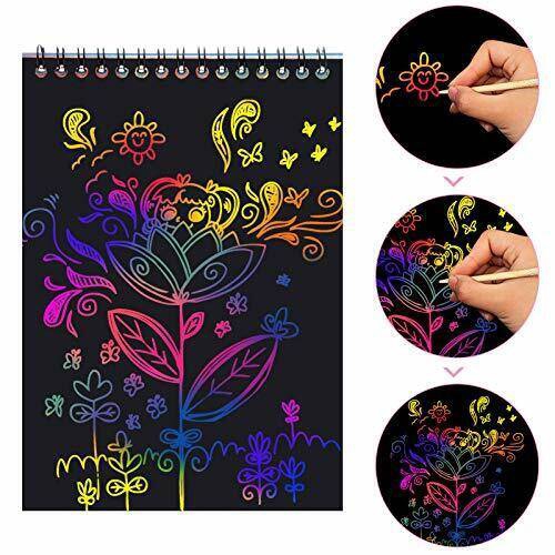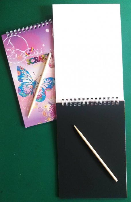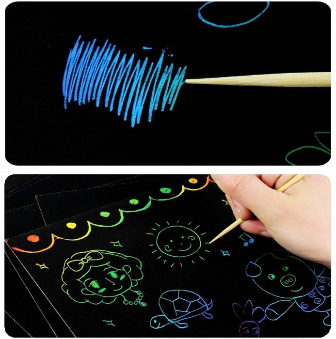 Using the wooden stylus, draw on the blank black 14 x 20cm sheets to reveal rainbow colours beneath and produce eye-catching works of art.