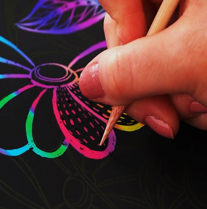 The white lines on the 21 x 28cm black pages reveal the different designs. Using the wooden stylus included, scratch away the white lines and shade areas that make up the design to reveal an array of colours, which as you work will develop into an amazing colourful nature- inspired artwork.